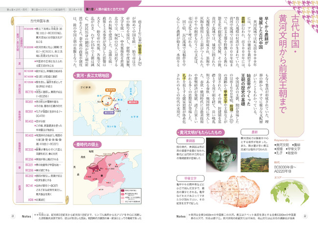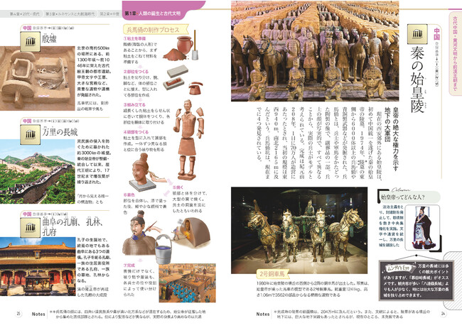 「学び直し」だからといって、学生のように暗記をしたり授業のような順番で学ぶ必要はありません。歴史の流れがわかる重要で面白い時代だけ、あるいはへ~っと言いたくなるような地形の仕組みだけ、ふんだんな図版とともに、見開き 2 ページごとに読み進められます。