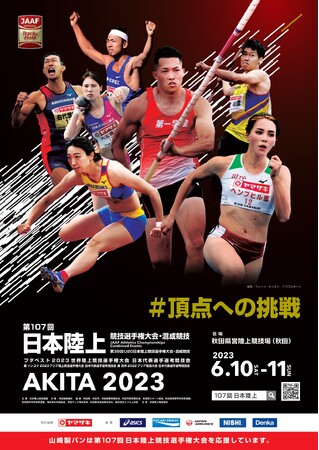 2023年6月10日(土)11日(日)に秋田県営陸上競技場開催する「第107回日本陸上競技選手権大会・混成競技」まであと50日! この度、大会キービジュアルが完成いたしましたのでお知らせいたします。 日本の王者が決まる日本選手権。本大会は「ブダペスト2023世界選手権」「バンコク2023アジア選手権」「杭州2022アジア競技大会」3つの国際大会の日本代表選手選考競技会を兼ねており、王者誕生と同時に「世界」への挑戦が始まります。 「頂点」を目指し、自分自身の目標や国際大会に向けた新たな挑戦に向けて、全力で戦う選手たちのパフォーマンスにご注目ください!