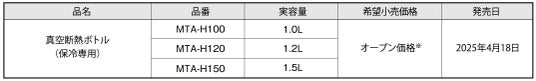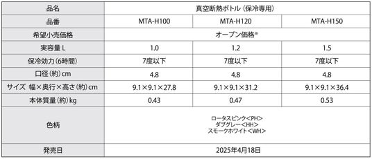 熱制御テクノロジーで世界をリードするタイガー魔法瓶株式会社(社長:菊池嘉聡、本社:大阪府門真市)は、「真空断熱ボトル(保冷専用)MTA-H100/H120/H150」を2025年4月18日(金)に発売いたします。