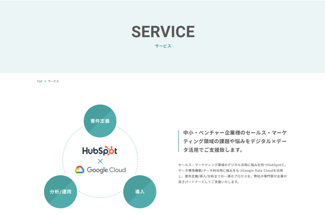 アンドデジタル株式会社は、「限りなき成長を、ともに。」をミッションに掲げ、マーケティングと営業領域に特化し、中小・ベンチャー企業向けのDX支援を行っております。HubSpotとGoogle Deta Cloudに強みを持っており、「デジタル活用支援」ではHubSpot・自社ツールの導入/運用/コンサルティングサービスを展開。