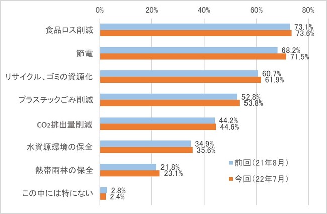 関心のある環境問題のトップは「食品ロス削減」で73.6%。次いで「節電」が伸び71.5%。さらに「リサイクル、ゴミの資源化」と身近な問題が続きます。「CO2排出量削減」は44.6%で横ばいでした。