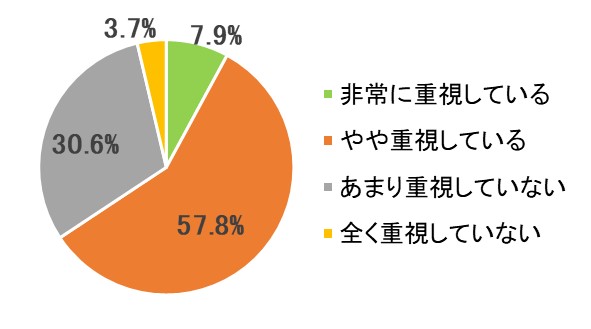 全体では「重視している(非常に+やや)」が65.7%で、「重視していない(あまり+全く)」34.3%を上回りました。前回調査(2021年8月)では、「重視している(非常に+やや)」が63.5%だったので増加傾向にあります。年代別では、「非常に重視している」が最も高いのは20代でした。また前回と比較しても20代で「重視している(非常に+やや)」が最も伸びています。若年層での環境配慮意識の高まりがうかがえます。