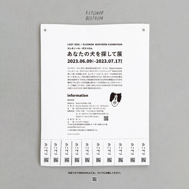 ギャラリー「のこぎり」(東京都渋谷区)は、アーチスト・Eleonor Bostrom(エレオノール・ボストロム)のギャラリー&ショップ「あなたの犬を探して展」を、2023年6月9日(金)から7月17日(月・祝)の会期にて開催します。