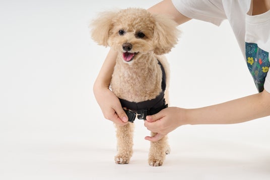 ズボンを履くように前脚を通し、背中で面ファスナーを留め、胸元の調整ベルトを締めるだけで装着が完了します。