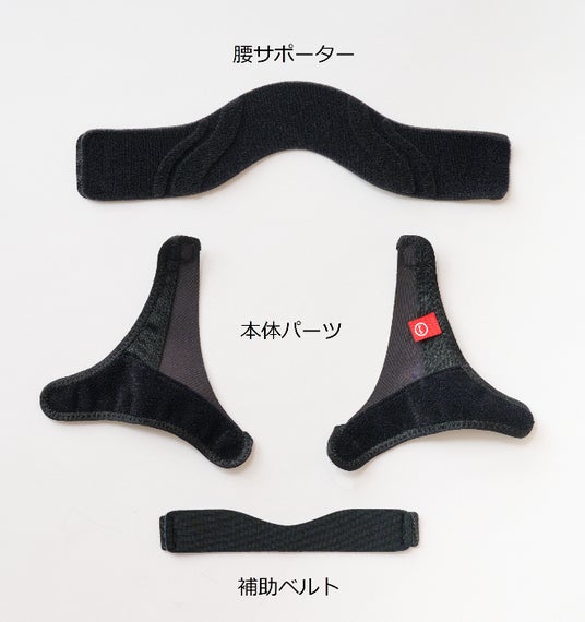 左右の大腿部に巻く本体パーツ、腰サポーター、外転を抑える補助ベルトで構成されています。セパレートタイプのため、簡単に装着できます。