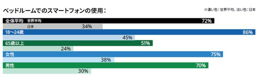 世界平均で72%はベッドルームでスマートフォンを使用していますが、日本では34%と使用率は低くなっています。日本の若年層はベッドルームでのスマートフォン使用率は45%ですが、年齢が高くなるにつれて(65歳以上は24%)その数値が下がっています。一方、就寝時にテレビを見るのは55歳以上が高い割合(42%以上)となっています。