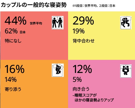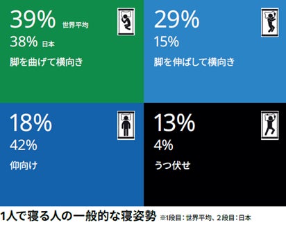 睡眠スコアの世界平均をみると、パートナーとの寝姿勢は向き合って寝る(100pt中70pt)人のほうが背中合わせで寝る(61pt)人よりも高いことがわかりました。日本ではほかの国と比べて向き合って寝る人が少ないため、睡眠の質を向上させる方法の一つとして、試しに向き合って寝てみてはいかがでしょうか。また、一人の時に睡眠スコアが最も高いのは仰向き(65pt)、次いで足を伸ばして横向き(64pt)、うつ伏せ(62pt)、足を曲げて横向き(61pt)という結果となりました。