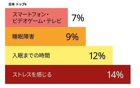 質のよい睡眠を妨げる原因として、各国共通で「ストレス」が最も多い結果となりました。日本では次いで、入眠までの時間や睡眠障害、慢性的な睡眠不足が挙げられます。そして世界平均(3%)よりも多い人(7%)が、スマートフォン・ビデオゲーム・テレビを要因としています。