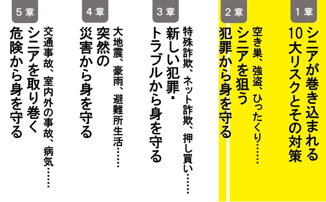 「巧妙化する特殊詐欺」「宅配業者・点検業者を装った強盗」「空き巣」「ひったくり」…などの犯罪、「大地震」「集中豪雨」「交通事故」「転倒」…などの自然災害・事故にどう備え・イザというときにどう対処したらいいか。