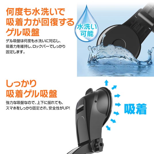 車載ホルダーのゲル吸盤は大きいので、どんな温度でも、しっかりとつけたいところにスマートフォンをつけられます。強力な吸盤なので、上下に揺れても、スマホをしっかり固定され、安全性がUP!車載ホルダーのゲル吸盤をぬるま湯で洗い、乾かして繰り返し使用できます。