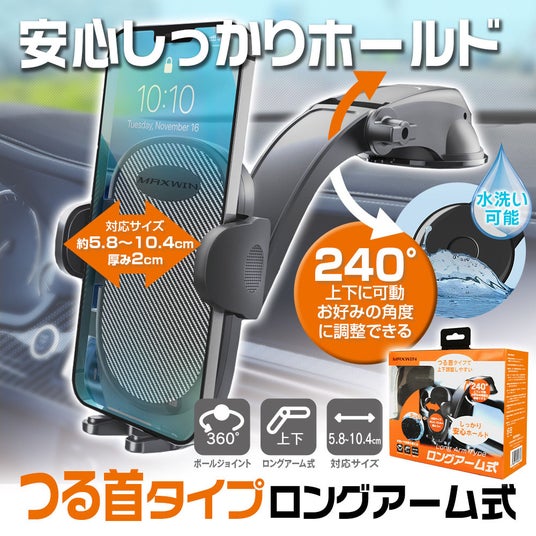 ホルダーとロングアームを接続箇所がボールジョイントの為、360°回転可能です。スマートフォンを縦置き・横置きにも対応できます。見やすい角度を傾けることが可能です。