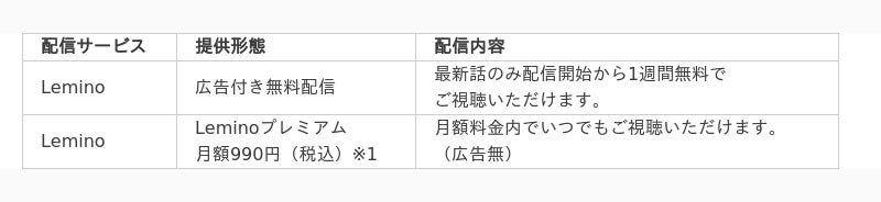 ・ 「Leminoプレミアム(App Storeでの購入)」「Leminoプレミアム(Google Playでの購入)」「Leminoプレミアムプリペイドカード」「Leminoプレミアム視聴用シリアルコード」をご利用のお客さまは、適用対象外です。