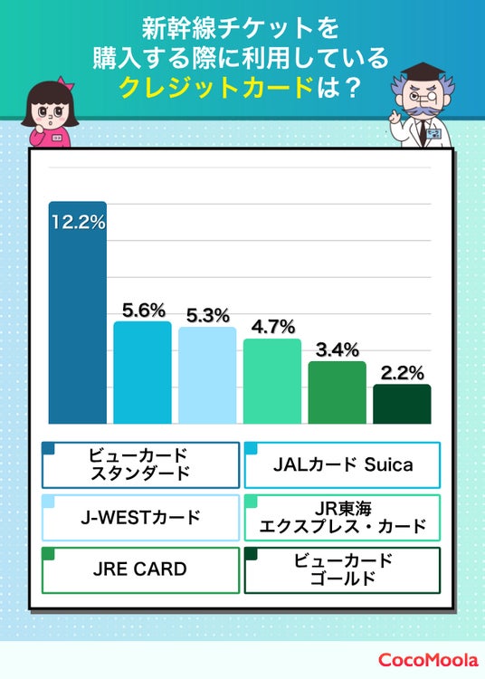 - 新幹線チケットを購入する際に利用しているクレジットカードは「ビューカード スタンダード」が最多で、全体の約1割を占める。