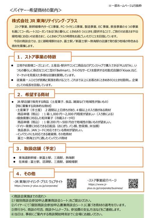 本商談会では、「PLUSTA」や「Bellmart」などの駅構内店舗を展開する株式会社JR東海リテイリング・プラスをバイヤーに迎え、両県の地域性豊かな商品を取り扱うサプライヤーとの商談機会を提供します。