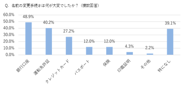 結婚して苗字が変わった人を対象に、「名前の変更手続きは大変でしたか?」と尋ねたところ、60%以上の人が結婚後、名前の変更手続きが大変だったと感じていることが分かりました。また、具体的に大変だったことを複数回答で尋ねたところ、「銀行口座」48.9%と答えた人が最も多く、2位「運転免許証」40.2%、3位「クレジットカード」27.2%と続きました。