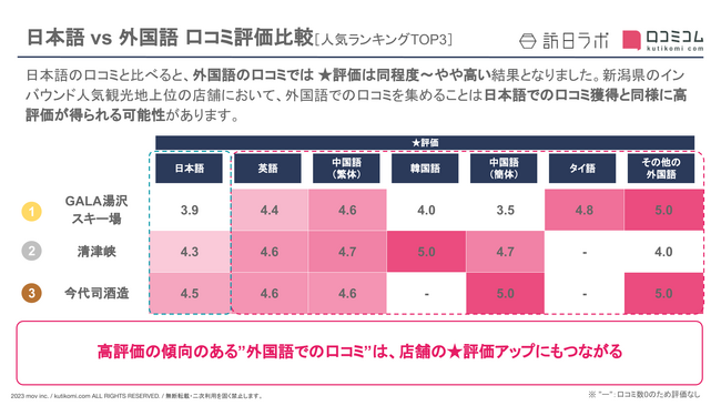 日本語の口コミと比べると、外国語の口コミでは ★評価は同程度~やや高い結果となりました。新潟県のインバウンド人気観光地上位の店舗において、外国語での口コミを集めることは日本語での口コミ獲得と同様に高評価が得られる可能性があります。