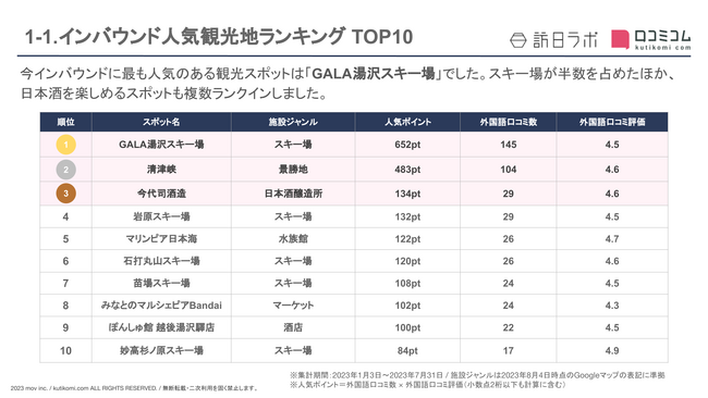 国内最大級メディア『訪日ラボ』及び 口コミサイトを”もっと”売上に変える店舗支援SaaS「口コミコム」を運営する株式会社mov(代表取締役:渡邊 誠、本社:東京都渋谷区、以下mov)は、観光名所に寄せられた最新の口コミデータから、独自の『インバウンド人気観光地ランキング』を発表しました。