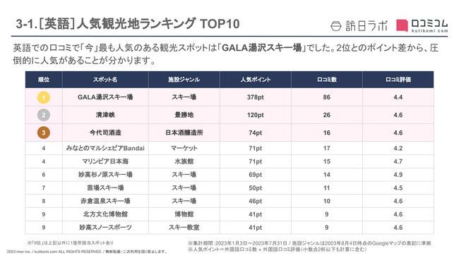 英語での口コミで「今」最も人気のある観光スポットは「GALA湯沢スキー場」でした。2位とのポイント差から、圧倒的に人気があることが分かります。