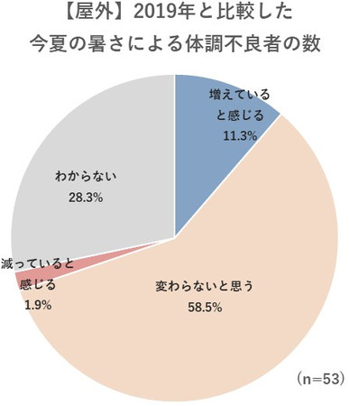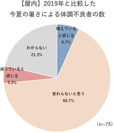 連日猛暑が続く今年の夏、暑さによって体調を崩した来訪客の数が、コロナ禍以前(2019年)と比較してどう変化したのか尋ねた結果がこちら。屋内と屋外で分けて見てみます。