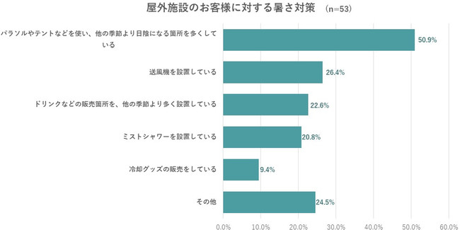 約5割の屋外施設は「パラソルやテントなどを使い、他の季節より日陰になる箇所を多くする」対策を実施しているとの事。施設によっては屋外で日陰を見つけるのに苦労するところもあります。夏時期は特に意識的に日除けを作る事で、来訪客の健康を守っている施設が多いようです。