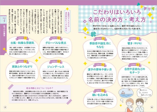 男の子・女の子はもちろん、中性的な響きのジェンダーレスな名前も多数掲載。また、名前を探すアプローチも多彩で、「響きから」「グローバルな視点から」「季節から」「願いから」「漢字から」など、パパ・ママが大切にしたいこだわりからも名づけが可能です。