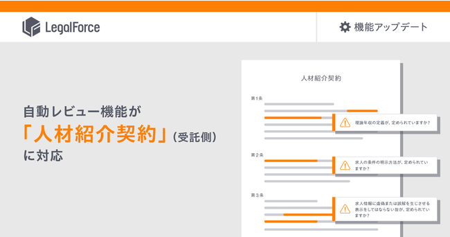 株式会社LegalOn Technologies(本社:東京都江東区 代表取締役:角田望)は、AI契約審査プラットフォーム「LegalForce」において、和文での「人材紹介契約」(受託側)の自動レビュー機能の提供を開始いたしました。これにより、人材紹介サービスを提供する企業で日常的に締結される「人材紹介契約」の契約審査にかかる労力を軽減し、抜け漏れや見落とし、法改正対応漏れのない契約審査業務の支援が可能となります。