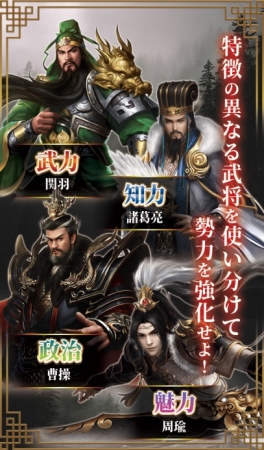 配下となる武将にはそれぞれ特徴があり「知力」「武力「政治」「魅力」のステータスにその特徴が現れています。知力を上げれば経済を回せるようになり、お金が集めやすくなり、魅力を上げれば、その魅力に多くの兵士が付いてくるでしょう。