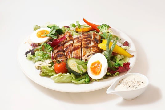 香ばしくソテーした鶏もも肉のコンフィをメインに葉野菜、素揚げした根菜類やマリネした紫キャベツにアボカド、ミックスビーンズ、トマトなどたっぷりの野菜を彩りよく盛り付けたパワーサラダです。