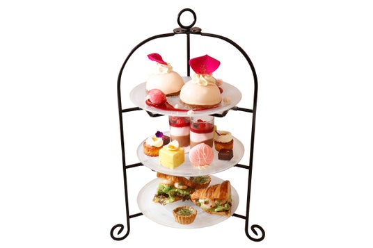中段にはローズとベリーのショコラベリーヌ、ピスタチオとアプリコットのケーキ、桃のマカロン、ココナッツとレモンのケイク、ボンボンショコラ、下段にはサンドイッチやミニキッシュを盛り合わせました。