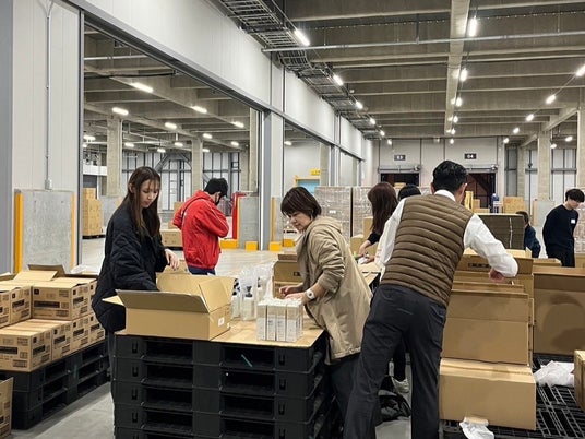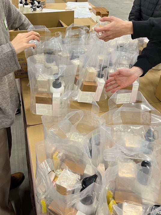 参画企業が募ったコスメバンクプロジェクトでの梱包ボランティア作業風景