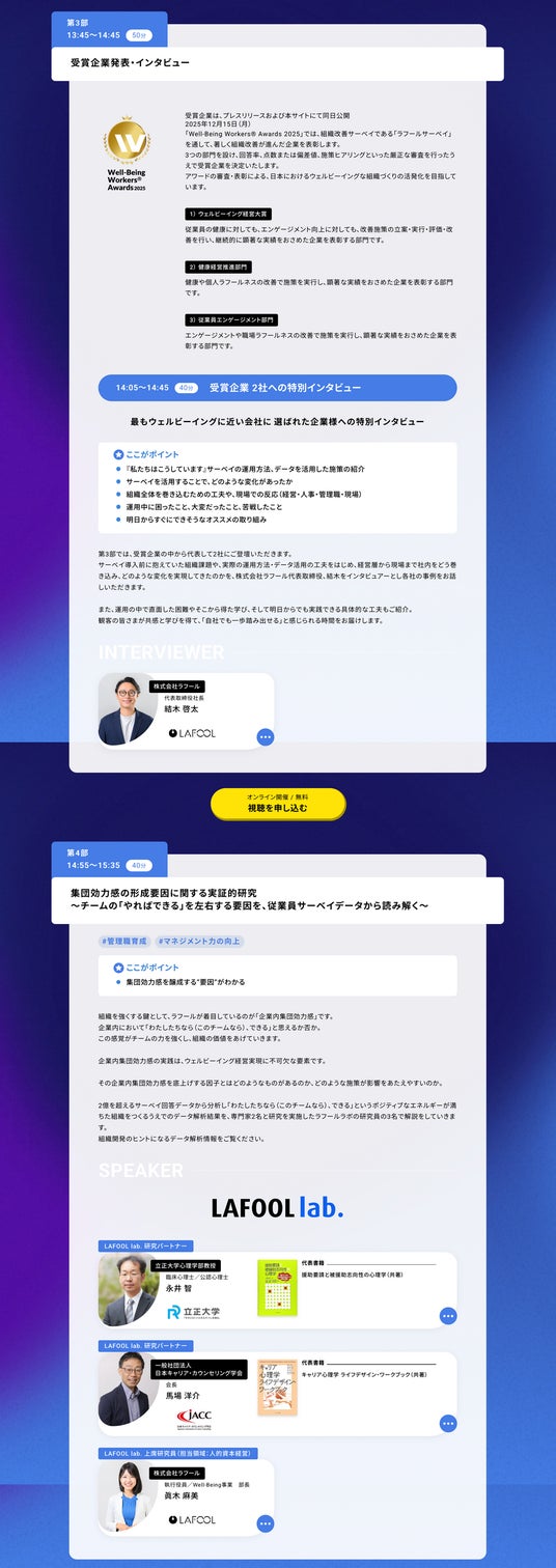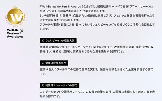 表彰の対象となるのは、組織改善ツール「ラフールサーベイ」を通して、著しく組織改善が進んだ企業です。ウェルビーイング経営大賞、健康経営推進部門、従業員エンゲージメント部門の3つの部門を設け、受賞企業の特別インタビューを予定しています。