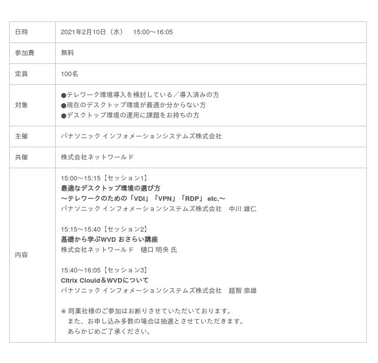 パナソニック インフォメーションシステムズ株式会社は、2021年2月10日(水)に「テレワークを支えるデスクトップ環境の最適解」にフォーカスしたオンラインセミナーを開催します。