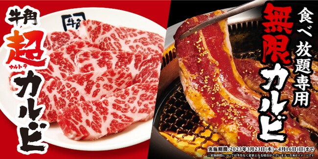 コロワイドグループの株式会社レインズインターナショナルが展開する牛角では、2023年3月23日(木)より肉厚ジューシーな「超(ウルトラ)カルビ」とごはんと肉の無限ループにはまる食べ放題専用「無限カルビ」が楽しめる春の超カルビ祭りを開催します。