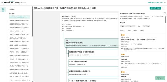 本機能により、ニュース・論文に加え、特許情報を初期段階から網羅的に参照することが可能になります。さらに、AIが提示した解決策のロジックツリーに対し、研究者や開発者が自身の知見を手動で組み込むことで、技術探索の初動フェーズを大きく短縮し、R&Dにおける「早期判断・早期解決」を実現します。