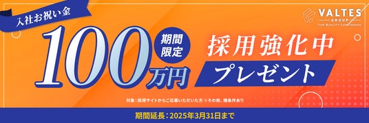ソフトウェアのテスト・品質向上トータルサポート企業のバルテス・ホールディングス株式会社(本社:大阪市西区、東京都千代田区、代表取締役会長 兼 社長:田中 真史、以下「当社」)は、当社グループ採用サイトから直接ご応募・ご入社いただいた方を対象に入社お祝い金として100万円をプレゼントする採用キャンペーンを、3月31日まで期間延長すること決定いたしましたことをお知らせいたします。