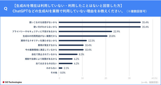 また、「現在は利用していない」「利用したことはない」と回答した方に理由を聞いたところ、「使いこなせる自信がないから」「使い方がわからないから」がそれぞれ35.4%、「プライバシーやセキュリティに不安があるから」が22.9%と続いた。(n=48、複数回答)