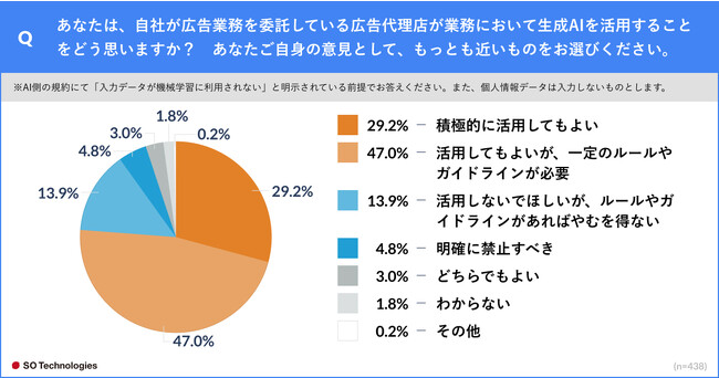 委託先の広告代理店が生成AIを活用することをどう思うかについて、回答者自身の考えにもっとも近いものを聞いたところ、「活用してもよいが、一定のルールやガイドラインが必要」が最多で47.0%、次いで「積極的に活用してもよい」が29.2%となり、76.2%が肯定的な意見となった。