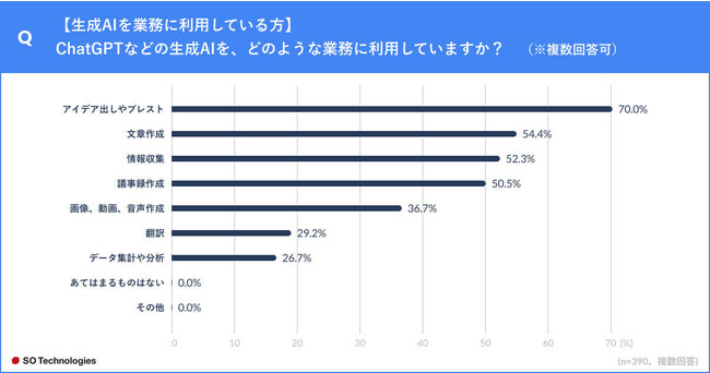 具体的な業務内容ではアイデア出しやブレストが70.0%、文章作成が54.4%、情報収集が52.3%、議事録作成が50.5%の順に多くなっている。(n=390、複数回答)