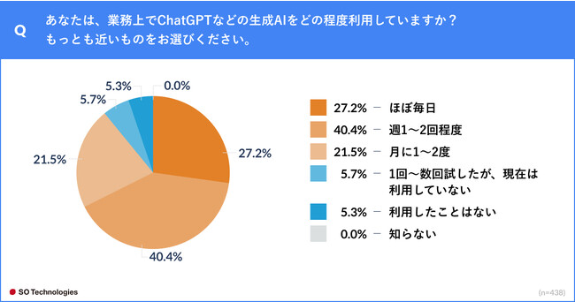 ソウルドアウト株式会社(本社:東京都文京区 代表取締役社長CEO兼CCO:荒波 修)の連結子会社であり、マーケティングテクノロジーの力で地域活性化を推進するSO Technologies株式会社(本社:東京都文京区 代表取締役:荒木 央、以下「当社」)は、インターネット広告を広告代理店に委託している広告主438人(※)を対象に、「インターネット広告代理店の生成AI活用に関する調査」を実施しました。本リリースでは、業務における広告主の生成AI利用頻度、委託先の広告代理店が生成AIを活用することに対する考えと所属企業の対応方針に関する結果を紹介しています。
