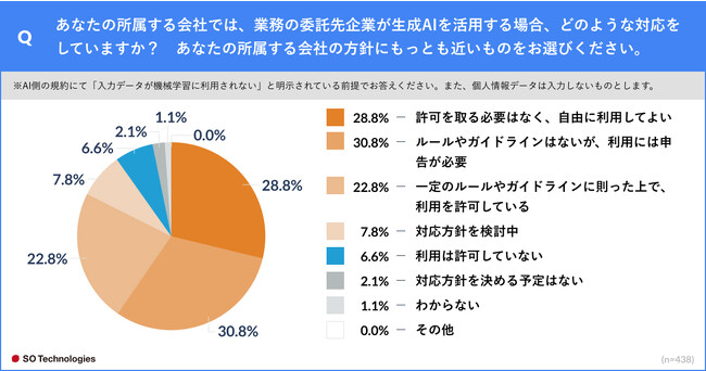 回答者の所属する会社にて、業務の委託先企業が生成AIを活用する場合の対応方針について聞いたところ、「ルールやガイドラインはないが、利用には申告が必要」が最多で30.8%、次いで「許可を取る必要はなく、自由に利用してよい」が28.8%、「一定のルールやガイドラインに則った上で利用を許可している」が22.8%と続いた。また、「利用は許可していない」はわずか6.6%であった。(n=438、単一回答)