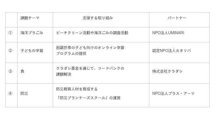 海洋プラごみ、子どもの学習、フードロス、防災の4つの課題をテーマに以下の団体を支援します。