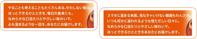開発担当者の想いとして、ほっとシチューがみなさんの毎日の生活に少しでも寄り添える製品であってほしいと思っています。担当者が考える「こんなときにほっとしてほしい」というシーンをパッケージ裏面に8種類作成しました。ほっとしたいタイミングに、ぜひパッケージを片手にほっとシチューを食べてみてください。みなさんに「こんな気持ちあるよね」と思ってもらえたらうれしいです。