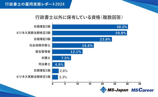 加えて、行政書士が併用して保有している資格についても調査を行いました。結果、最も保有率が高かったのは「日商簿記2級(30.2%)」でした。