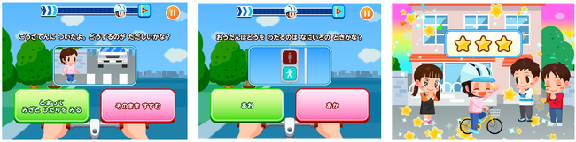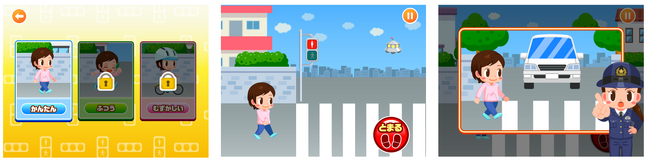 友達の家に行く道中で事故に合わないよう、危険な場所を注意しながら進んでいく交通シミュレーションゲームです。歩く、走る、自転車の3つのモードで遊ぶことができます。危険な場所を見つけたら「とまる」ボタンをタップし、注意しながら進みます。危険な場所で止まらないと警察官のキャラクターから注意を受け、止まると褒められ、一度も注意を受けることなく友達の家にたどり着くことを目指します。
