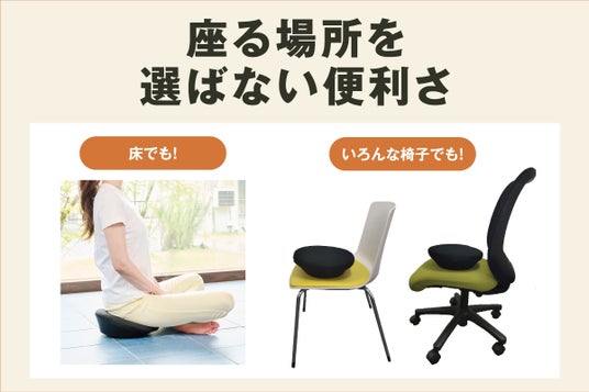空気で膨らませる一般的なバランスボールに比べて省スペースで、ダイニングチェアやオフィスチェアなど椅子を選ばずどんな座面にも置いて使用できます。座って骨盤を動かすことで仕事中やTVを見ながら、簡単にストレッチができ、「ながら運動」の習慣作りも期待できます。