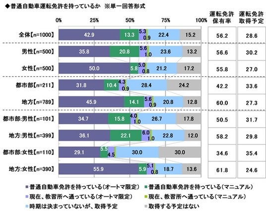 また、「現在、教習所へ通っている(オートマ限定)」は5.3%、「現在、教習所へ通っている(マニュアル)」は0.9%、「時期は決まっていないが、取得予定」は22.4%で、合計した『運転免許取得予定』は28.6%でした。