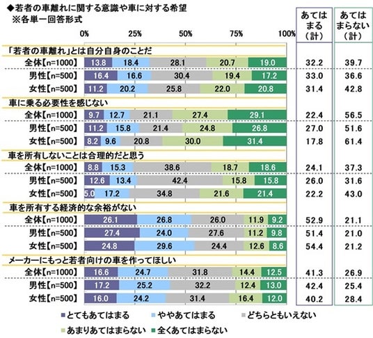 全回答者1,000名に、若者の車離れに関する意識や車に対する希望について、それぞれどの程度あてはまるかを聞きました。