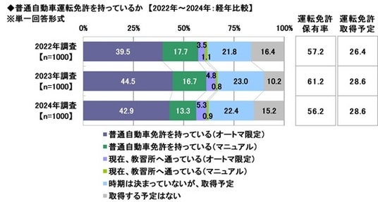 『運転免許保有率』を過去の調査結果(※2)と比較すると、2023年61.2%から2024年56.2%と5.0ポイント下降し、今年は一昨年(2022年57.2%)と同水準となりました。