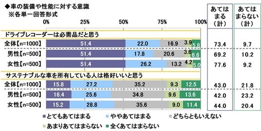 全回答者1,000名に、車の装備や性能に対する意識について、それぞれどの程度あてはまるかを聞きました。