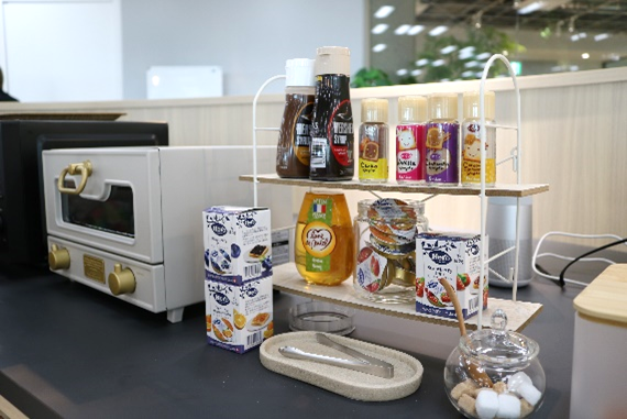 お菓子やジャム、紅茶のティーバックなども自由に使うことができ、ゆっくり休めるカフェのような空間になっています。